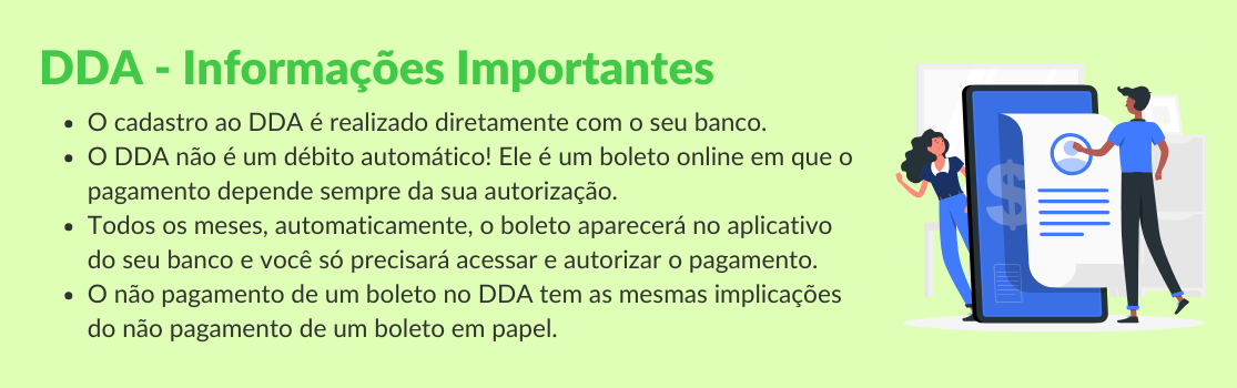 Esse benefício é gratuito e permite que você o utilize no pagamento do seu plano de saúde, mas também da mensalidade escolar, taxa de condomínio, financiamentos, entre outros. Isso porque você pode habilitar o DDA para todas as contas que são cobradas por boleto bancário. Dessa forma você consegue praticidade e facilidade no pagamento dos seus boletos e na gestão das suas contas.