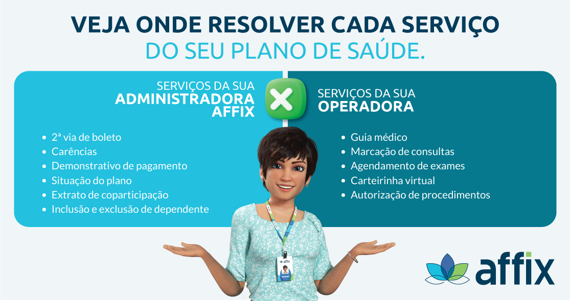 Basicamente, a Affix cuida da parte administrativa e a operadora cuida do atendimento médico hospitalar! Confira na imagem abaixo os principais serviços que você pode precisar e quem deve procurar para cada solicitação.