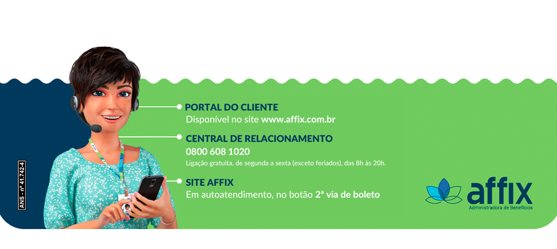 – No ato do pagamento, confira a Razão Social da Affix: AFFIX ADMINISTRADORA DE BENEFÍCIOS LTDA ou AFFIX BENEFÍCIOS.